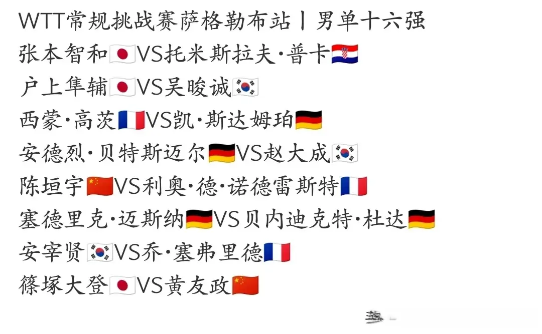 男单16强全部产生,德国队占四席,法国队、日本队、韩国队各占三席,国乒有两人晋级。