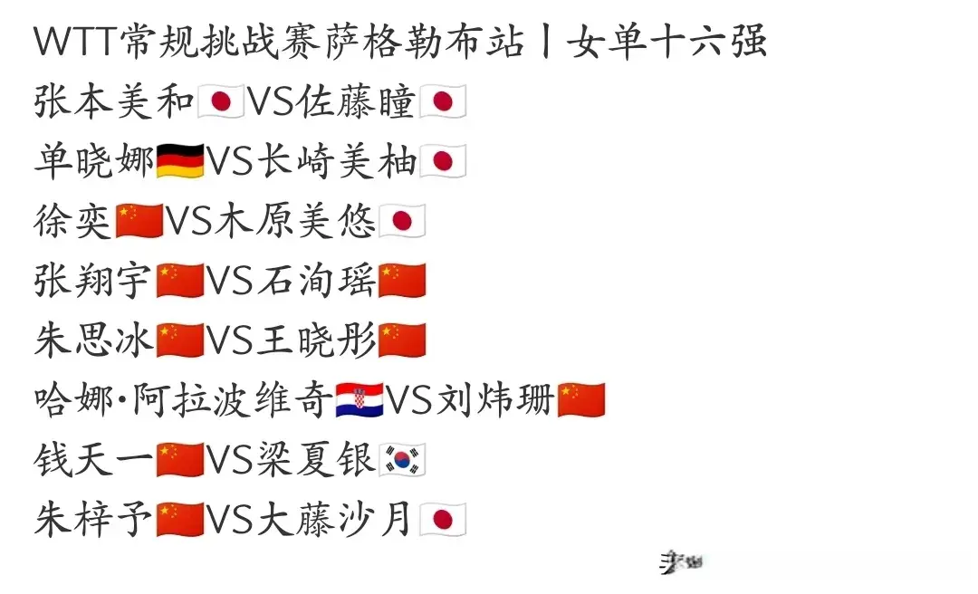 萨格勒布常规挑战赛正赛首日结束男女单打1/16决赛、男女双打及混双1/8决赛,男女单打16强全部产生,国乒10人晋级,6人淘汰出局,日本队8人晋级4人淘汰出局,韩国队4人晋级6人淘汰出局。昨天的比赛也出现了爆冷的情况,2号种子向鹏、3号种子达科、3号种子早田希娜、4号种子申裕斌遭遇一轮游。