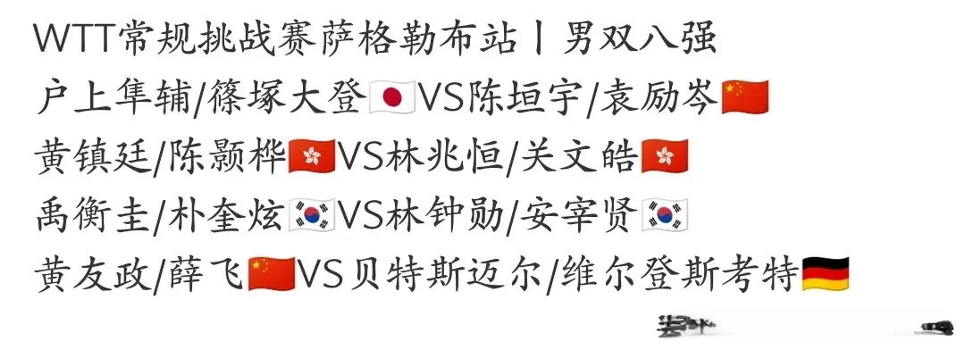 男双八强全部产生,国乒两席,韩国队、中国香港队各有两席,日本队参赛的一对组合顺利晋级。
