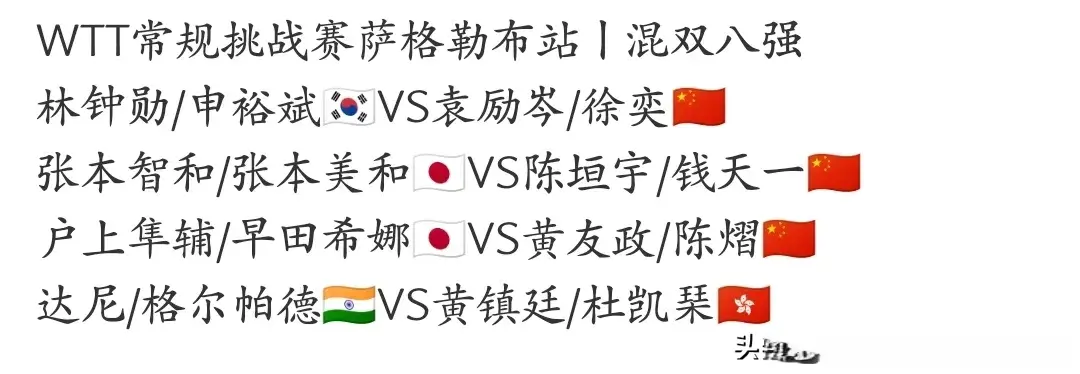 混双1/4决赛,两场中日对决,黄友政/陈熠对阵户上隼辅/早田希娜,